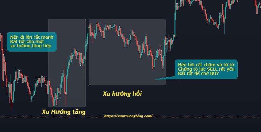 Chúng ta nhìn nến và có sự so sánh ví dụ ta xác định con sóng sẽ còn tăng tiếp và thấy nến đang hồi lại