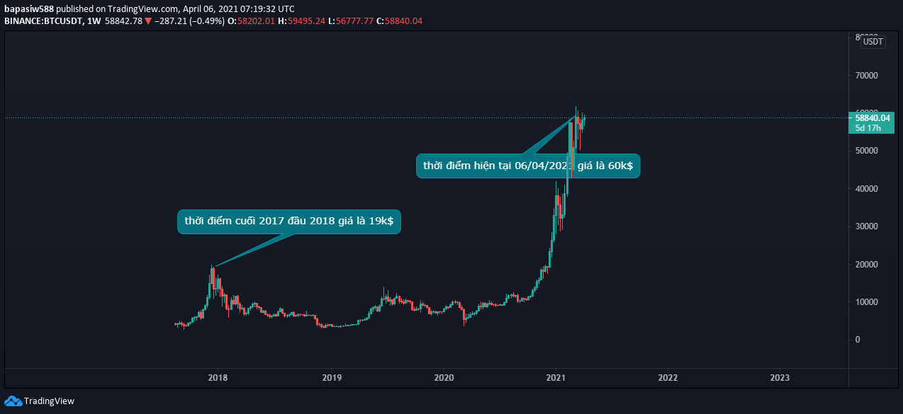 Nói vậy thôi chứ để thay đổi tiền mặt thì còn rất nhiều thứ phải cần thời gian để các tổ chức cá nhân thấy được sự thay đổi thực sự mà BTC đem lại, hiện tại chắc chỉ có giơi thượng lưu ” người giàu” mới có thể sở hữu được BTC mà thôi, thời điểm mình viết bài là 58.8k$/ 1 BTC và mình tin rằng con số này dù có xuống bao nhiêu đi chăng nữa thì nó sẽ lại phá đỉnh này và lại tiến đến những đỉnh tiếp theo chúng ta hãy chờ xem.
