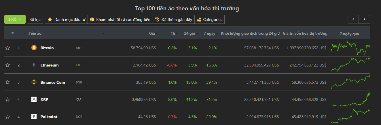 Top đầu tiền ảo theo coingecko