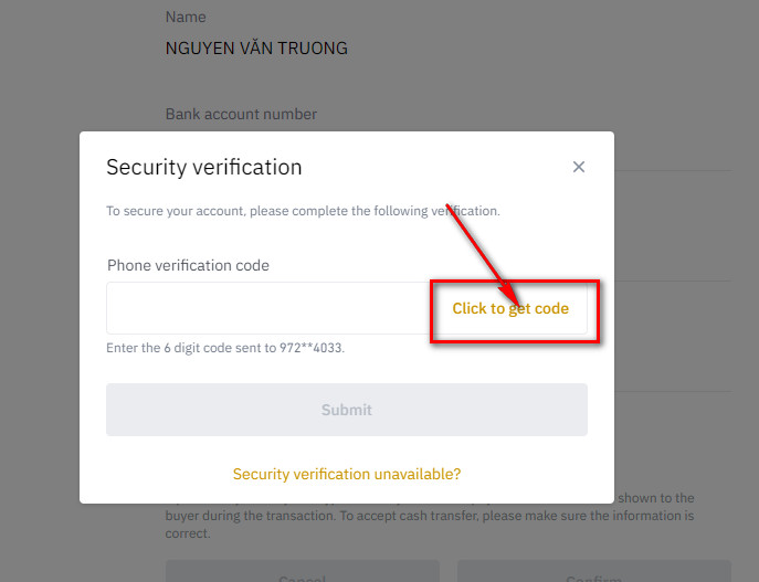 Ta nhấn click to get code để nhận mã xác thực về điện thoại và nhập mã vào ô trống kia và nhấn Submit như hình