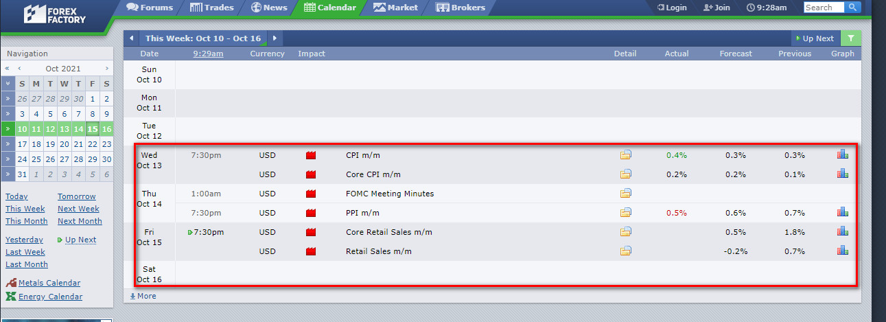 Ví dụ: đây là mình check tin tức bên Forex factory ngày 13/10/2021 lúc 7h30 tối sẽ có tin CPI và Core CPI như trong hình dưới đây.