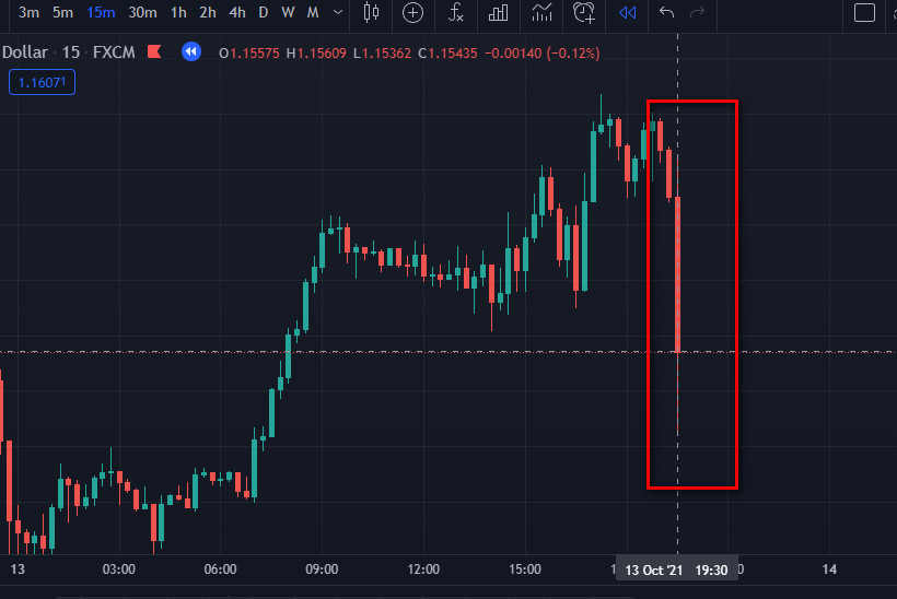 Chúng ta có thể thấy trong hình một cây nến đỏ 15p rất mạnh lao xuống ngay khi ra tin.