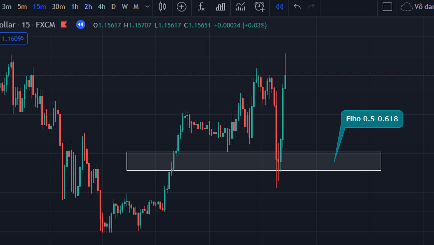 Và theo cách hiểu của phân tích kĩ thuật và hợp thức hóa đường đi của giá khi giá đã chạy xong ta phân tích là giá đã hồi lại và phản ứng với vùng Fibo 0.5-0.618 như hình dưới đây để đi lên lại
